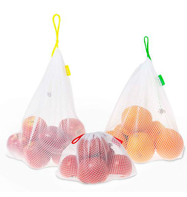 El KIT de bolsas reutilizables en malla contiene: 3 bolsas grandes (30x35 cm) 3 bolsas medianas (25x30 cm).