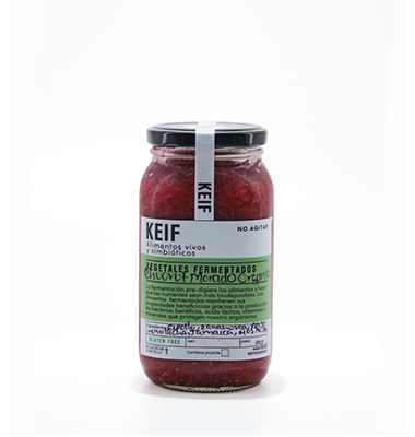 Mezcla de vegetales orgánicos: Repollo morado, puerro fermentado, flor de Jamaica lacto fermentada, miso artesanal, mostaza fermentada antigua de la casa y especias.