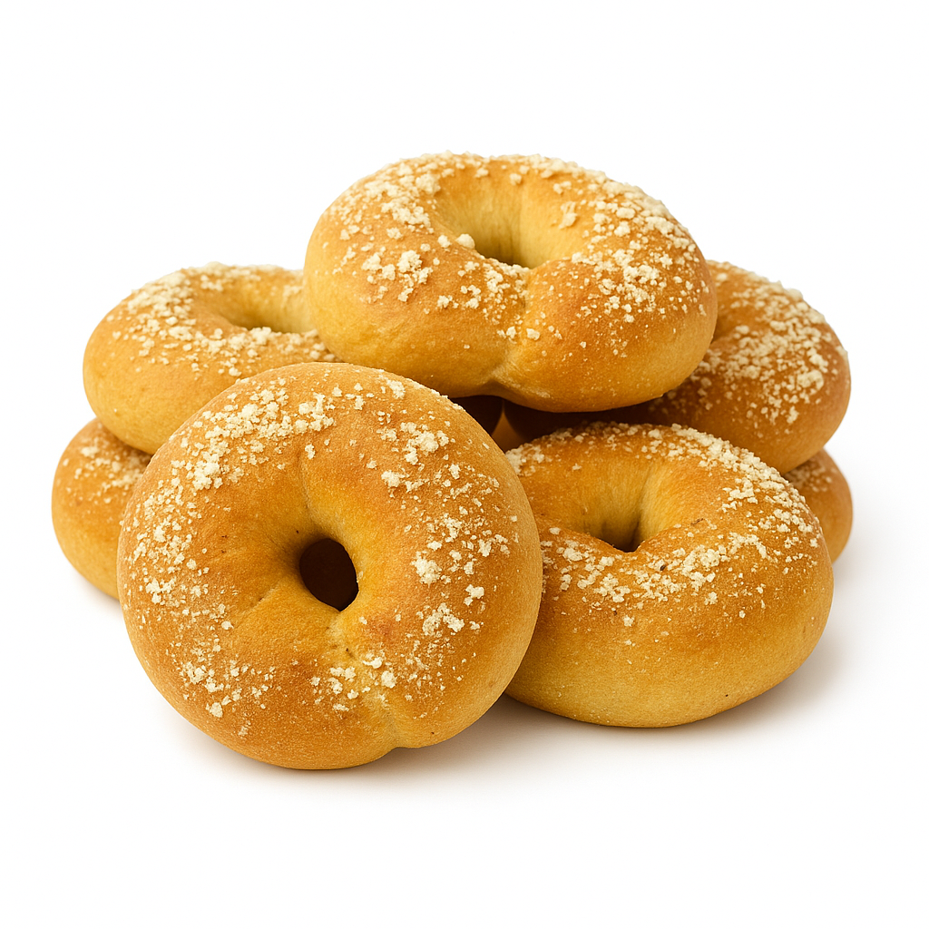 Paquete de roscones elaborados harina de trigo integral, una pizca de panela, levadrua, linaza, grasa vegetal, leche de coco, rellego de dulce de guayaba natural y trozos de almendras.